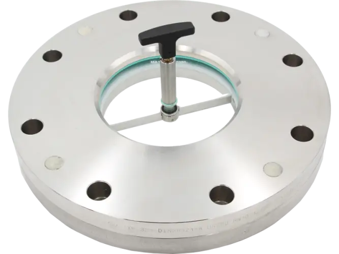 Pomiędzy dwoma wysokiej jakości kołnierzami ze stali nierdzewnej i falistą uszczelką PTFE po stronie medium, zamocowany jest wziernik wykonany z chemicznie odpornego szkła borokrzemianowego MAXOS® DIN7080. Dzięki temu, że uszczelka ta jest w stanie zwarcia, części kołnierzowe wziernika leżą bezpośrednio na sobie, chroniąc w ten sposób płytkę szklaną tak skutecznie, jak to możliwe.